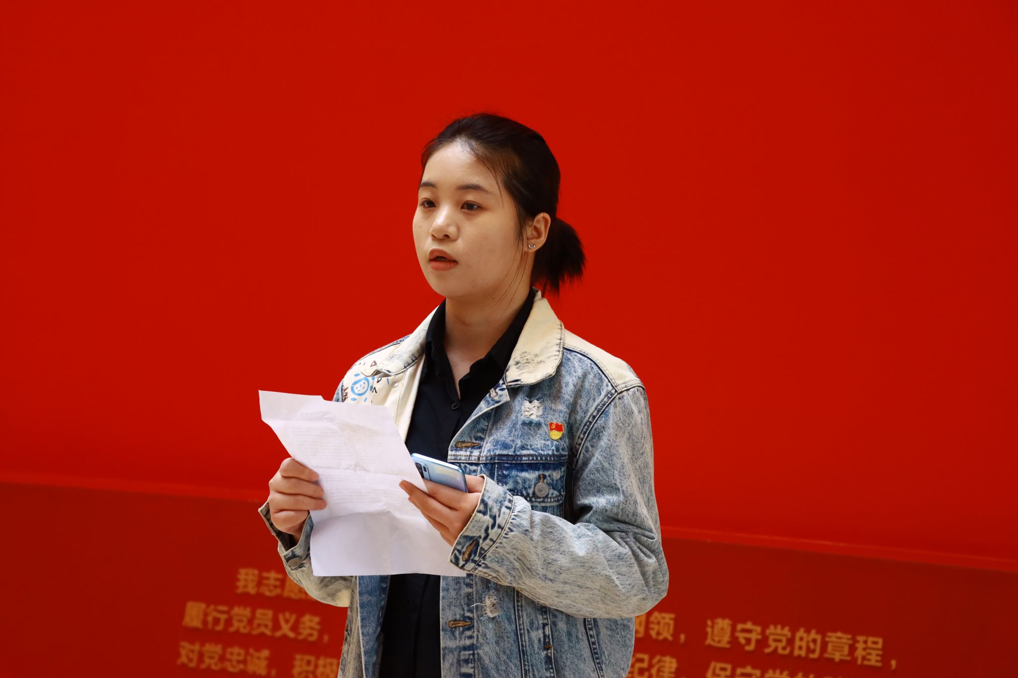 主持人唐嘉浩同学宣布活动第二项进程——党员代表戴欧阳同学发言。戴欧阳同学从打深学思基本功、铸牢担当意识体、磨快能力刀锋锯这三方面具体概述,号召全体毕业生党员举好中国特色社会主义旗,把稳中国特色社会主义前行舵。