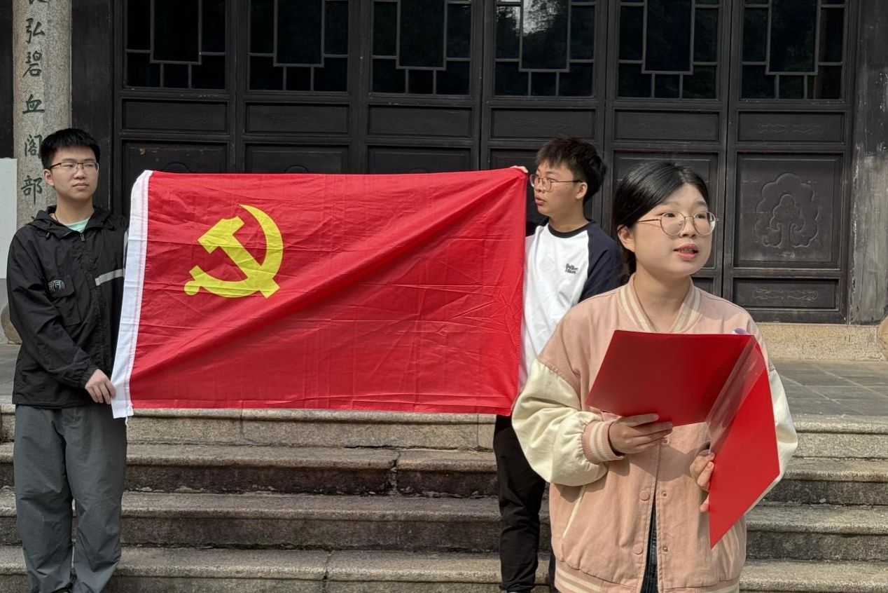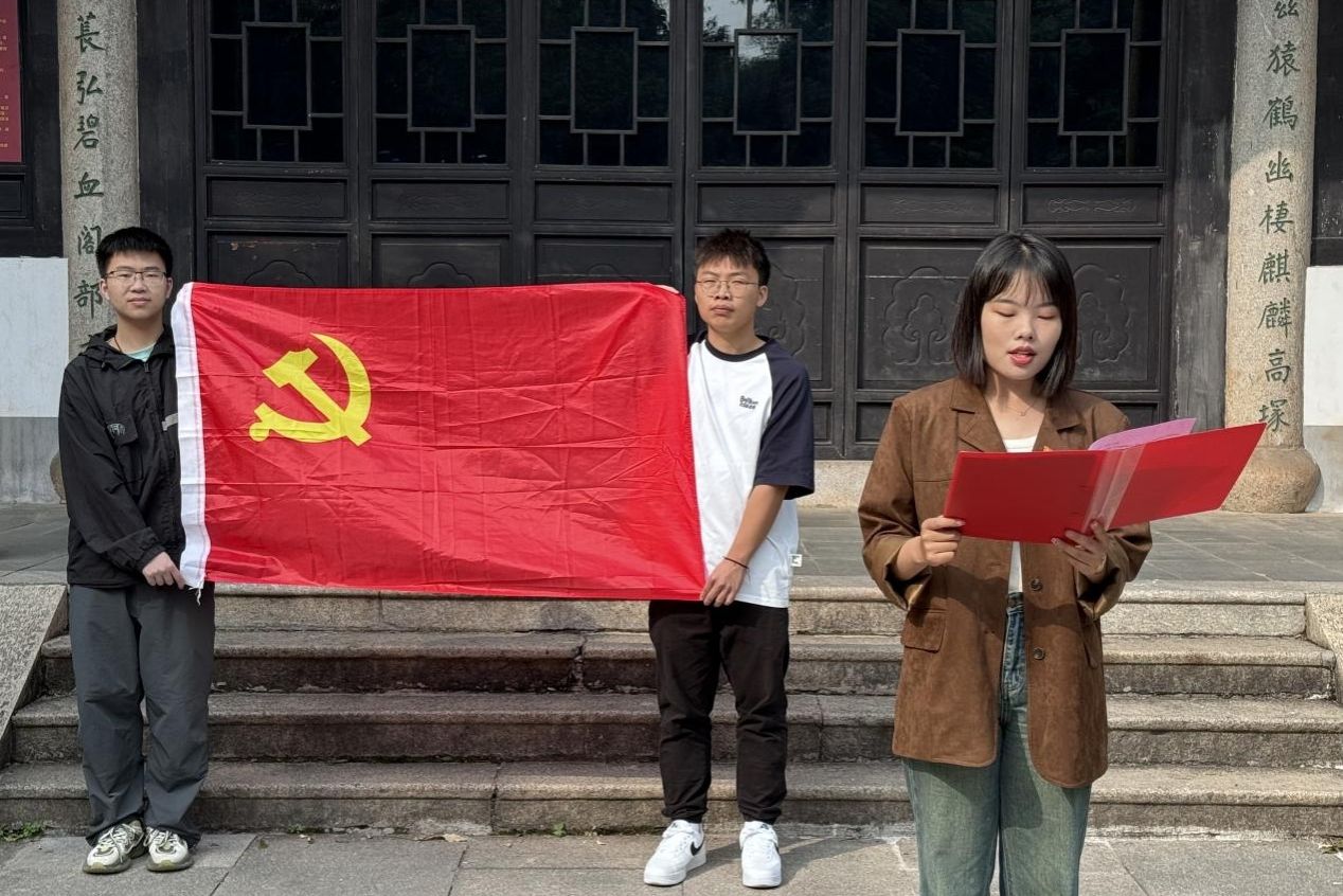 入党宣誓仪式于忠烈祠前坪举行,仪式分为吴晴致辞及宣读党员名单、发放并佩戴党徽、谌鑫怡带领党员同志重温入党誓词、正式党员代表、预备党员代表发言和支部成员自由讨论五项议程。吴晴提出,深入学习贯彻党的二十大精神应在原原本本学、联系实际学、利用网络学、交流探讨学四个方面下“苦功夫”,以学促进二十大精神的贯彻落实。正式党员代表表示,各党员同志应紧密团结在党的周围,跟好党的脚步,推动二十大精神于实践中落实。预备党员代表表示,各位预备党员应学习党的精神思想,具备党员的基本素质,为党补充新鲜血液。支部成员在自由讨论中提及要挖掘麓山忠烈祠等爱国主义教育资源,推动理论学习教育走深走实,并从中汲取丰富的政治营养,不断拓宽视野,树立远大理想。