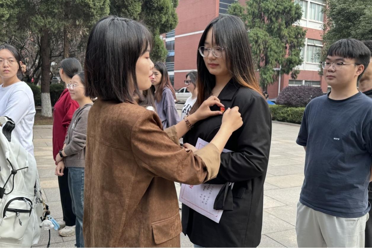 吴晴为预备党员佩戴党徽