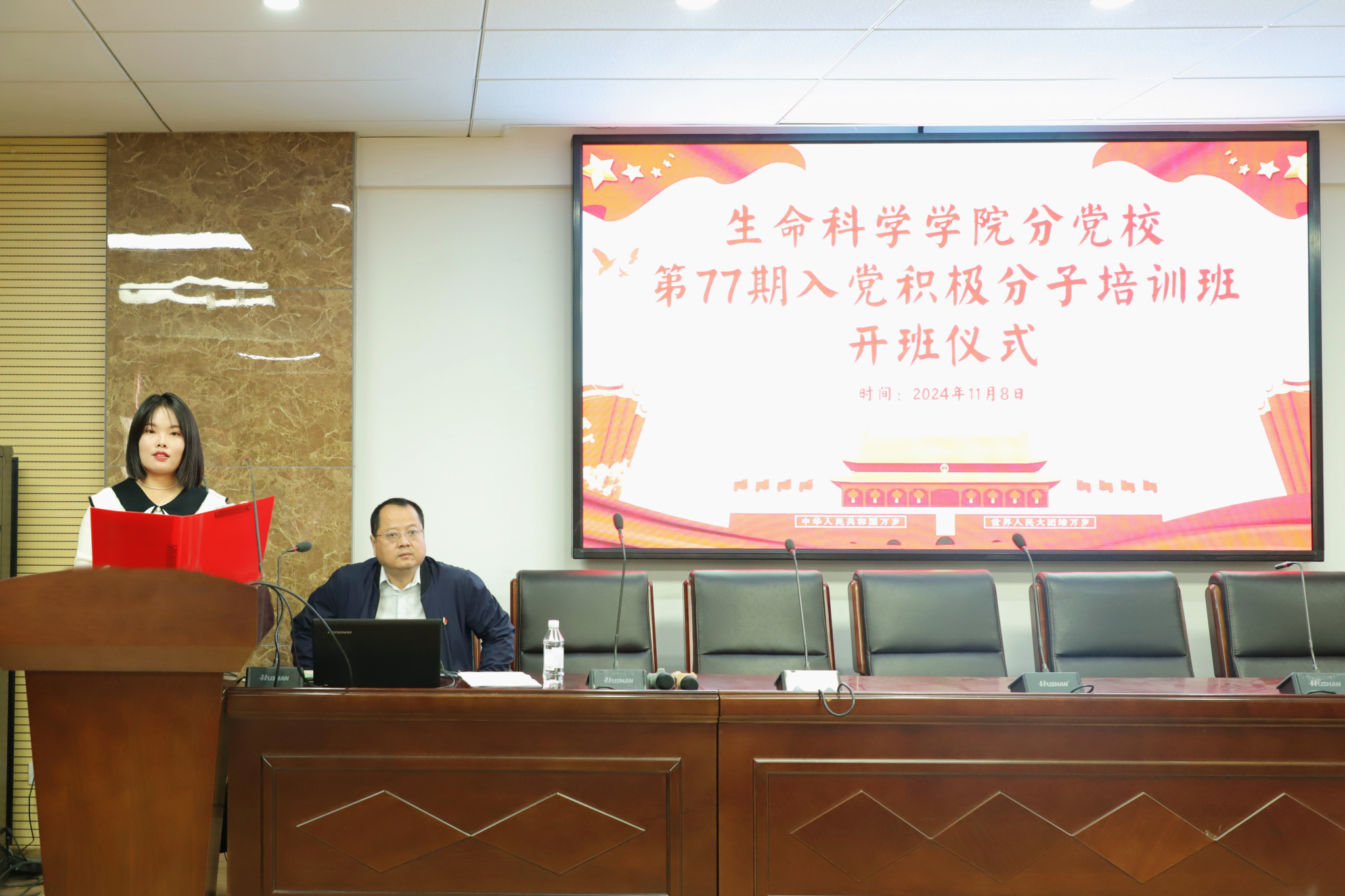 仪式第二项,学员代表毛艺颖发言。毛艺颖表达了对加入中国共产党的强烈渴望和坚定决心,表示将珍惜这次难得的培训机会,认真学习党的理论知识,不断提高自身政治素养,以实际行动向党组织靠拢,争做合格的社会主义建设者和接班人。