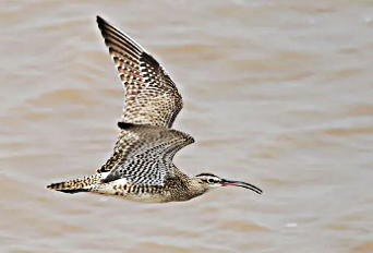 大杓鹬体型大,体色为黄褐色。飞行时,翅下密布黑褐色斑纹。