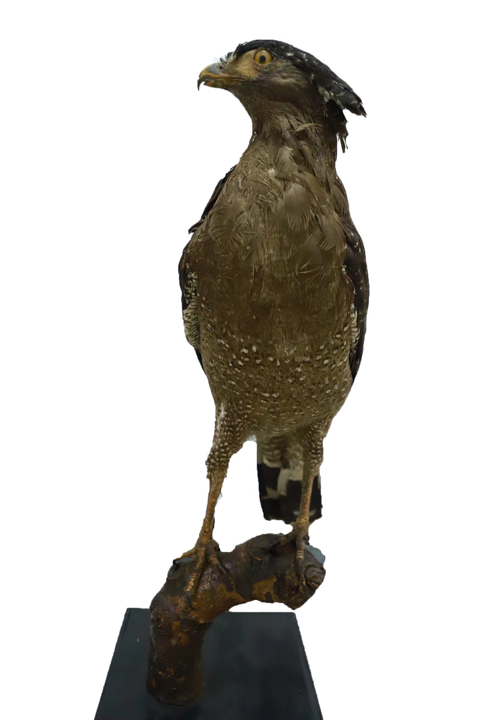 蛇雕前额白色,头顶黑色,羽基白色;枕部有大而显著的黑色羽冠,通常呈扇形展开,其上有白色横斑。上体灰褐至暗褐色,具窄的白色或淡棕黄色羽缘,尾上覆羽具白色尖端,尾黑色,具1条宽阔的白色或灰白色中央横带和窄的白色尖端,翅上小覆羽褐色或暗褐色,具白色斑点,飞羽黑色,具白色端斑和淡褐色横斑。