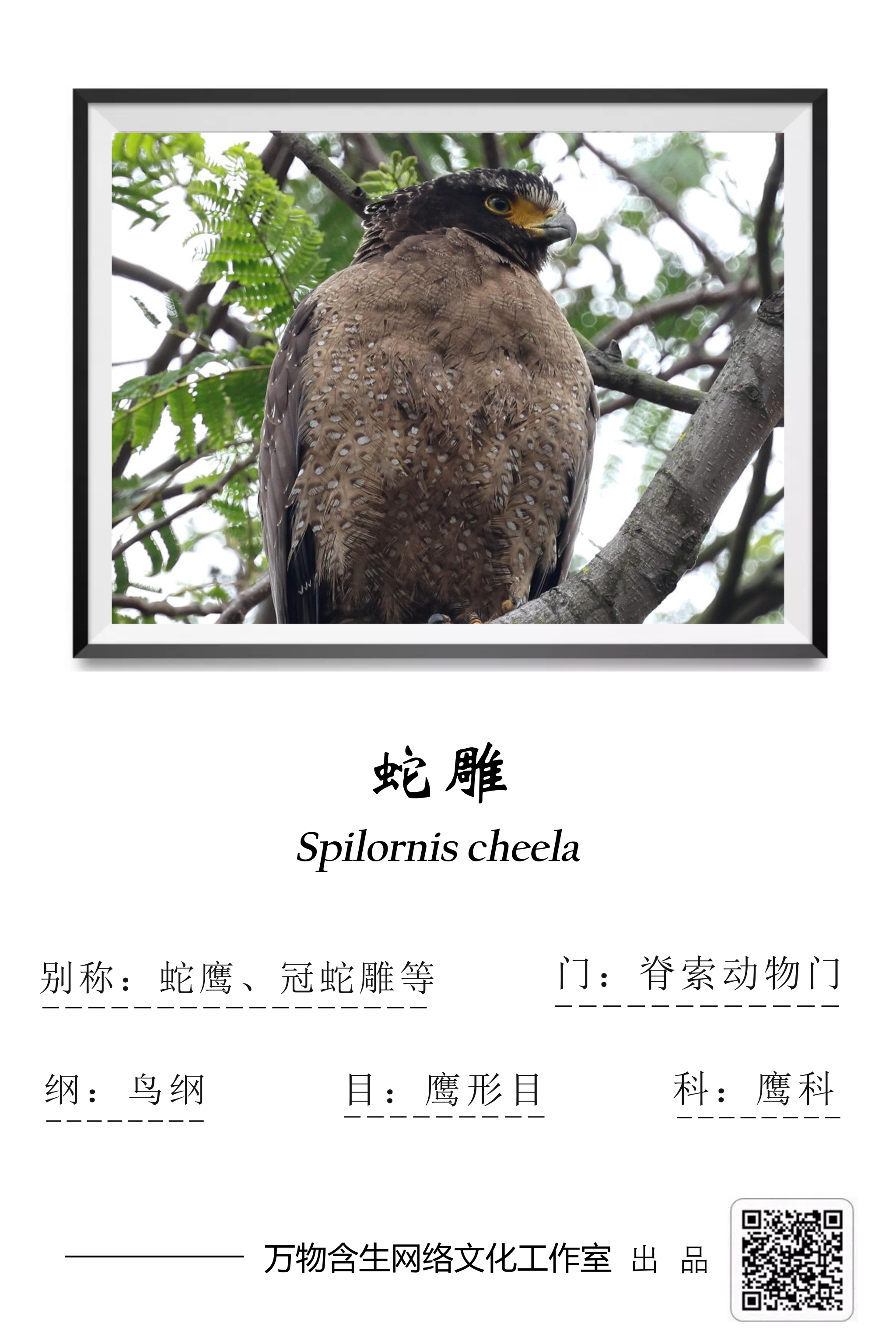 蛇雕(Spilornis cheela)是属于隼形目鹰科蛇雕属,是大中型鹰类。其别名是蛇鹰、蛇鵰、白腹蛇雕、冠蛇雕、凤头捕蛇雕,被列入《世界自然保护联盟濒危物种红色名录》(IUCN)2016年——无危(LC)和我国《国家重点保护野生动物名录》二级、《濒危野生动植物种国际贸易公约附录Ⅰ、附录Ⅱ和附录Ⅲ》(CITES)2019年版附录Ⅱ。