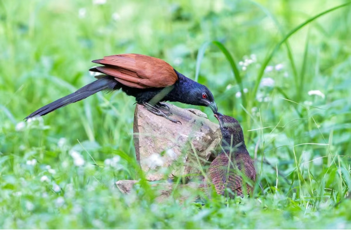 声好像母鸡的“咯,咯”声。褐翅鸦鹃一般营巢于草丛、灌木丛、芦苇、竹