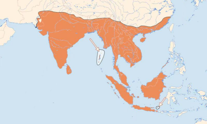 世界分布:孟加拉国、不丹、文莱、柬埔寨、中国、印度、印度尼西亚、老