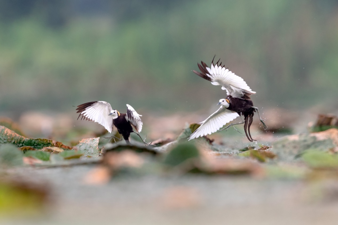 水雉每年的四月末进入繁殖季节,水雉将飞羽一次全部脱落,失去飞翔能力,并更换上黑白相间十分醒目的繁殖羽,一直到八月末陆陆续续退下繁殖羽换上黄褐色的冬羽,才宣告繁殖季节的结束。