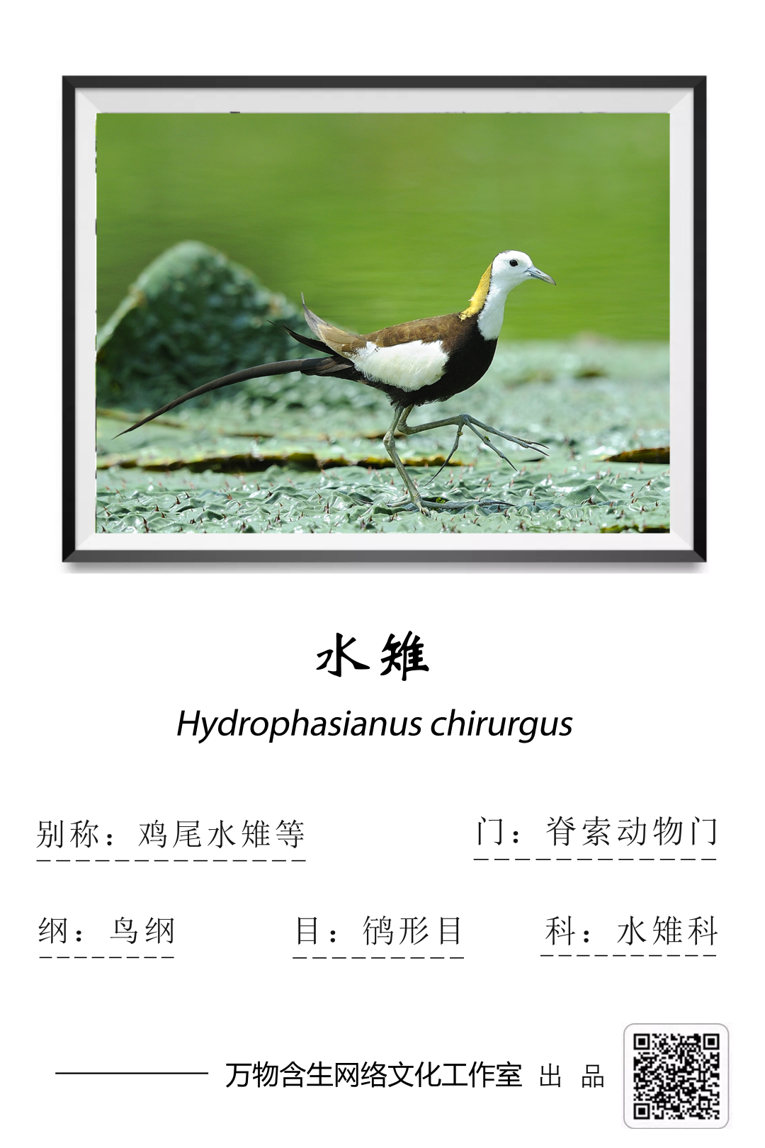 水雉(拉丁学名:Hydrophasianus chirurgus), 鸻形目水雉科水雉属,其别名有鸡尾水雉、长尾水雉,被列入《世界自然保护联盟》(IUCN) 2012年濒危物种红色名录ver 3.1——低危(LC)。入选国家林业局发布实施的《国家保护的有益的或者有重要经济、科学研究价值的陆生野生动物名录》。