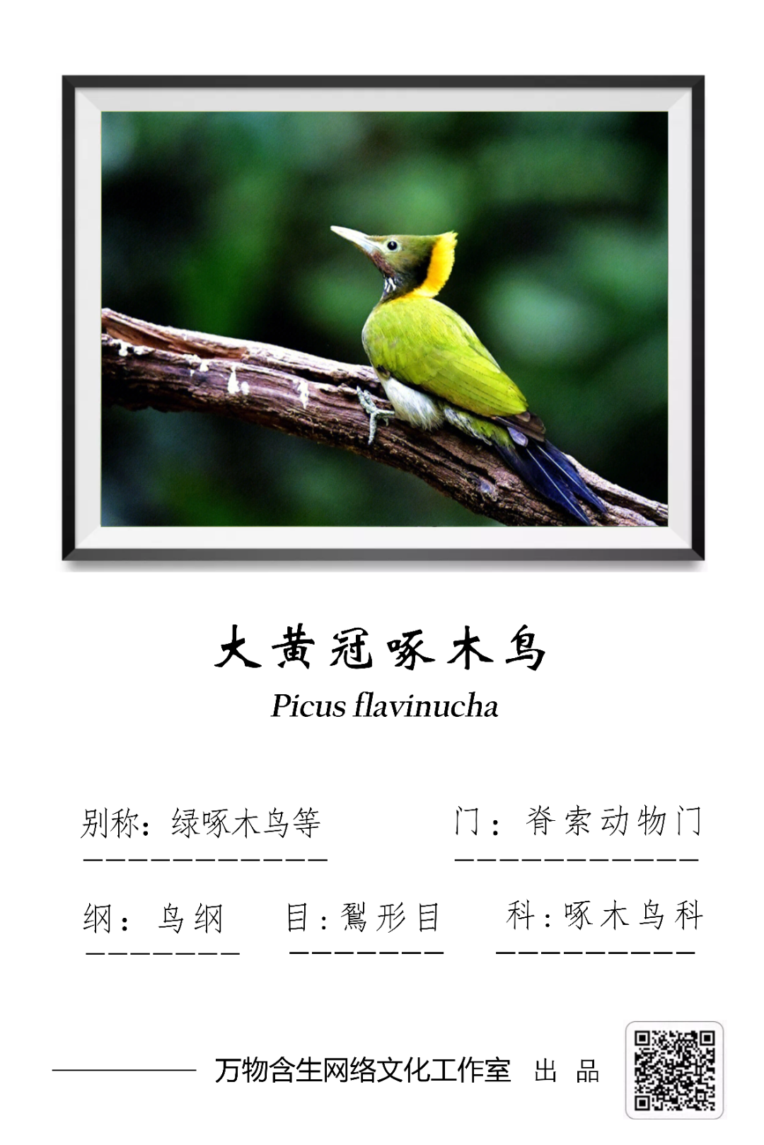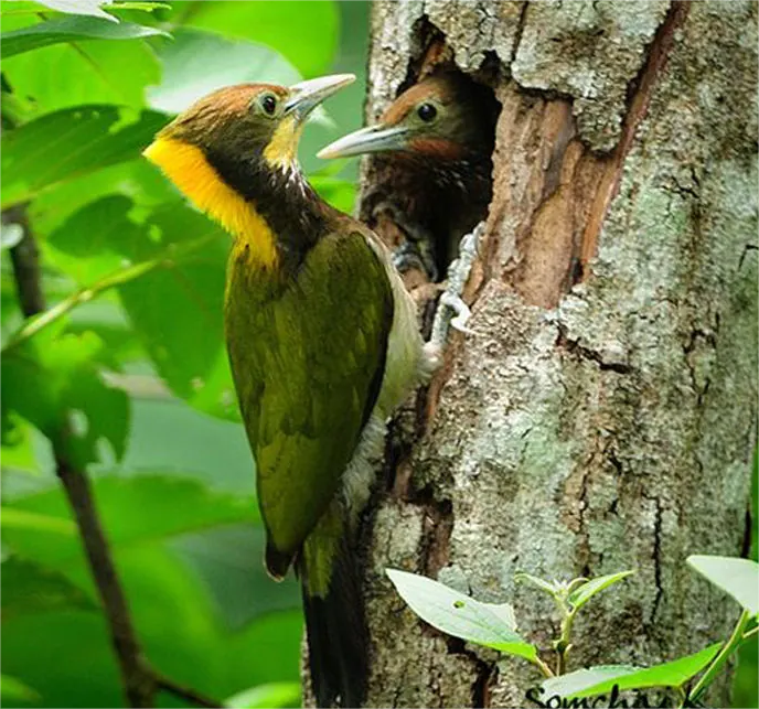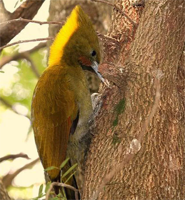 大黄冠啄木鸟(Picus flavinucha),又名绿啄木鸟等,鴷形目啄木鸟科,绿啄木鸟属,被列入《世界自然保护联盟濒危物种红色名录》(IUCN)2018年ver3.1——无危(LC)和中国《国家重点保护野生动物名录》二级。