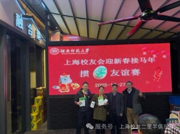 岁末将至,年味渐浓。为迎接2026马年新春,凝聚在沪校友力量,传承校友情谊,12月27日下午,湖南师大上海校友会“迎新春接马年”掼蛋友谊赛温馨启幕。生科院、医学院、化学院、新闻学院、物电学院、体育学院等12个学院的30余位校友代表踊跃参加本次比赛,湖南省驻沪办、上海湘西商会代表受邀出席。现场暖意融融、笑语盈盈,尽显校友相聚的喜悦与温情。