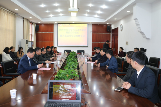 副校长欧阳峣代表学校和大北农水产科技集团总裁易敢峰签订了科技合作协议和奖助学金捐赠协议。